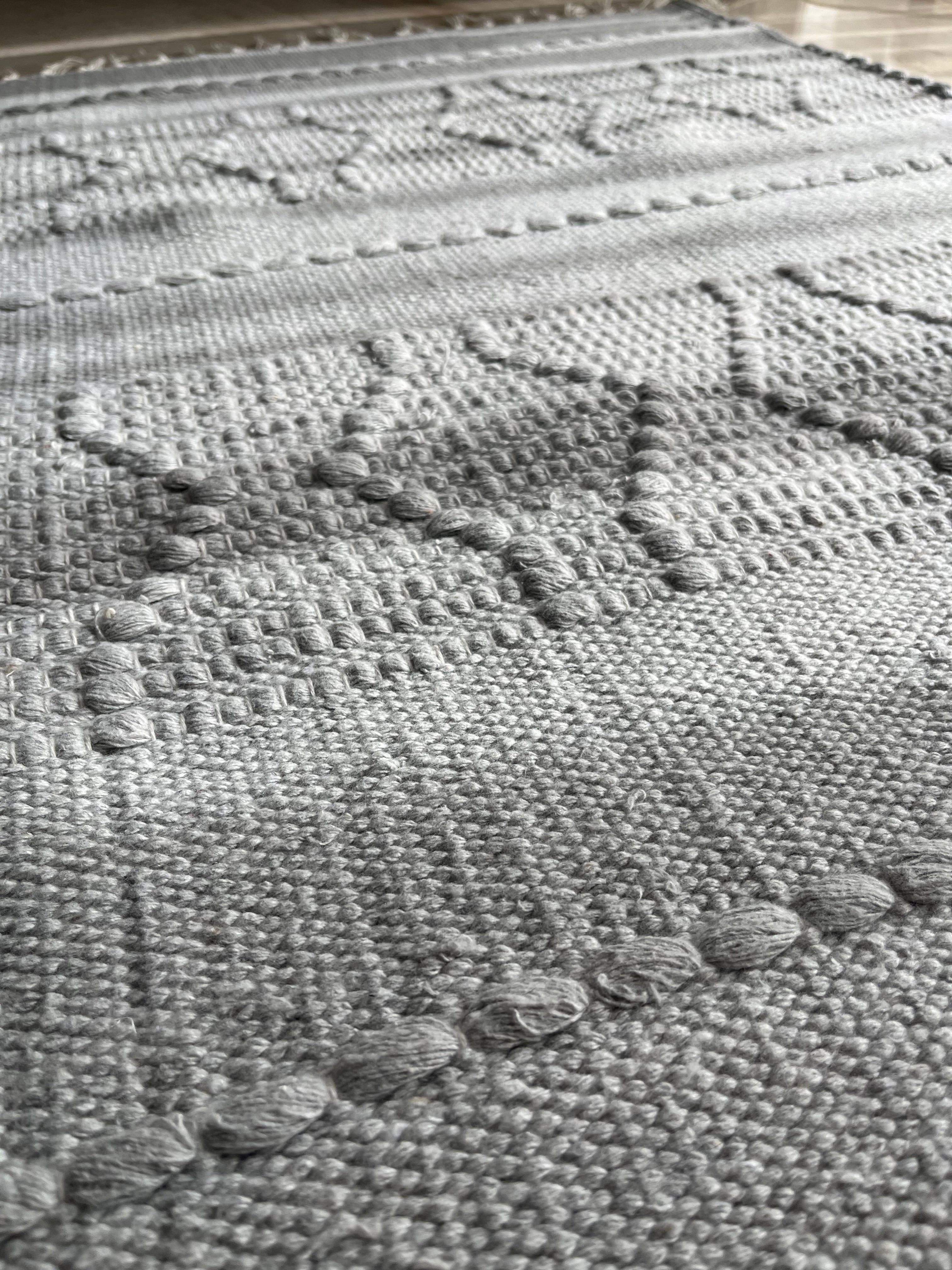 A beautifully woven soft-grey kilim featuring raised geometric detailing for subtle texture and depth. Its calm, neutral tone blends effortlessly with modern, Scandinavian, boho, and minimal interiors. Finished with hand-tied fringes for an artisanal touch.