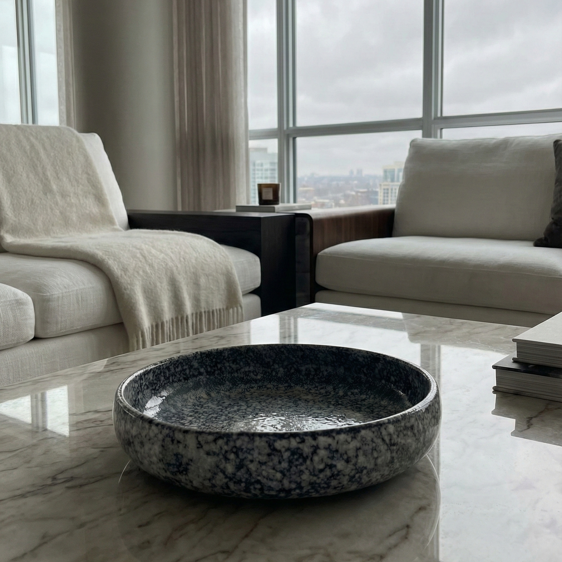 A shallow glazed clay bowl with a rich speckled finish that brings depth and character to any surface. Its wide, low-profile form makes it ideal for styling coffee tables, consoles, or dining spaces with a calm, modern feel.